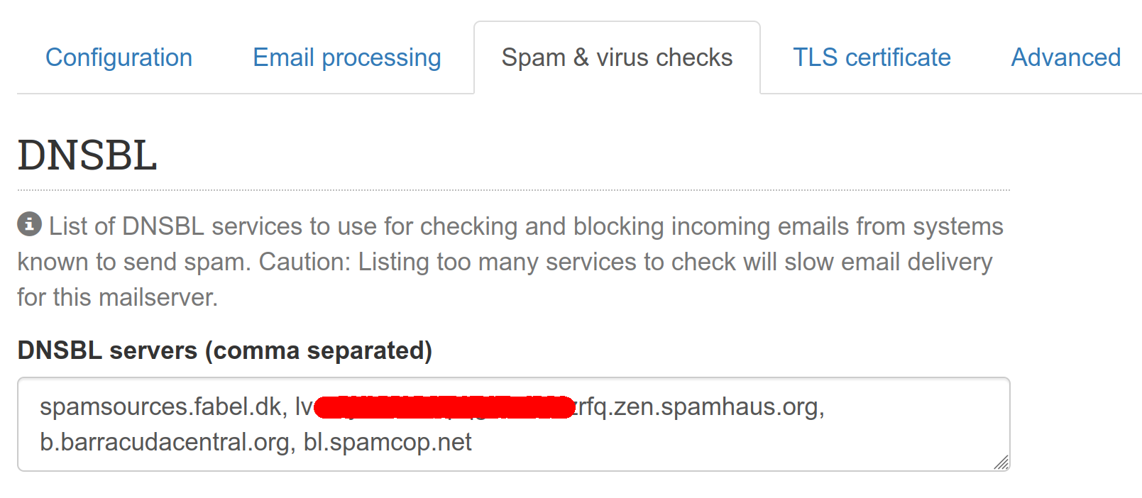 Because there are multiple systems preventing SPAM we also need to adjust settings in Haraka. Go to the Administration > System settings > Spam & virus checks and update Spamhaus's url at DNSBL field: